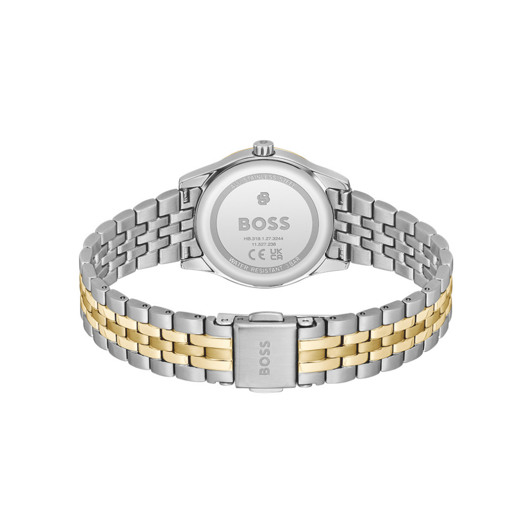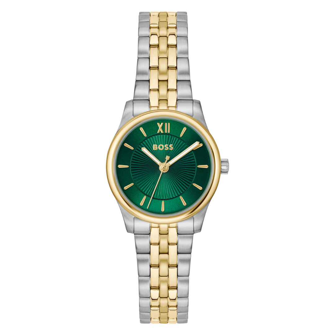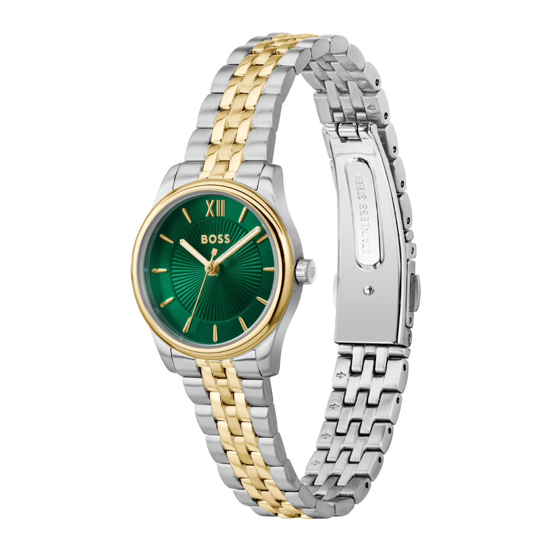 A striking green dial framed by a refined 25mm case gives this timepiece its distinctive, contemporary character. The stainless steel construction is complemented by light yellow gold IP accents across the bracelet, creating a balanced two-tone finish suited to both day and evening wear. Clean index markers ensure clear readability, while the reliable quartz movement delivers precise timekeeping. Protected by mineral glass and water-resistant to 30 metres, it’s designed for confident everyday use. Secured with a push-button deployment clasp, this BOSS Graceful Mina offers a polished, modern statement, elegant, versatile and effortlessly composed on the wrist.