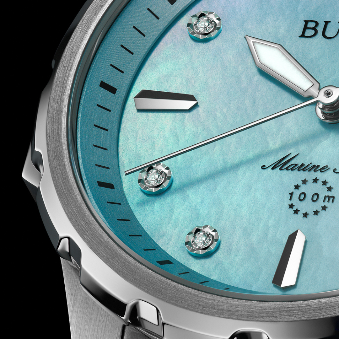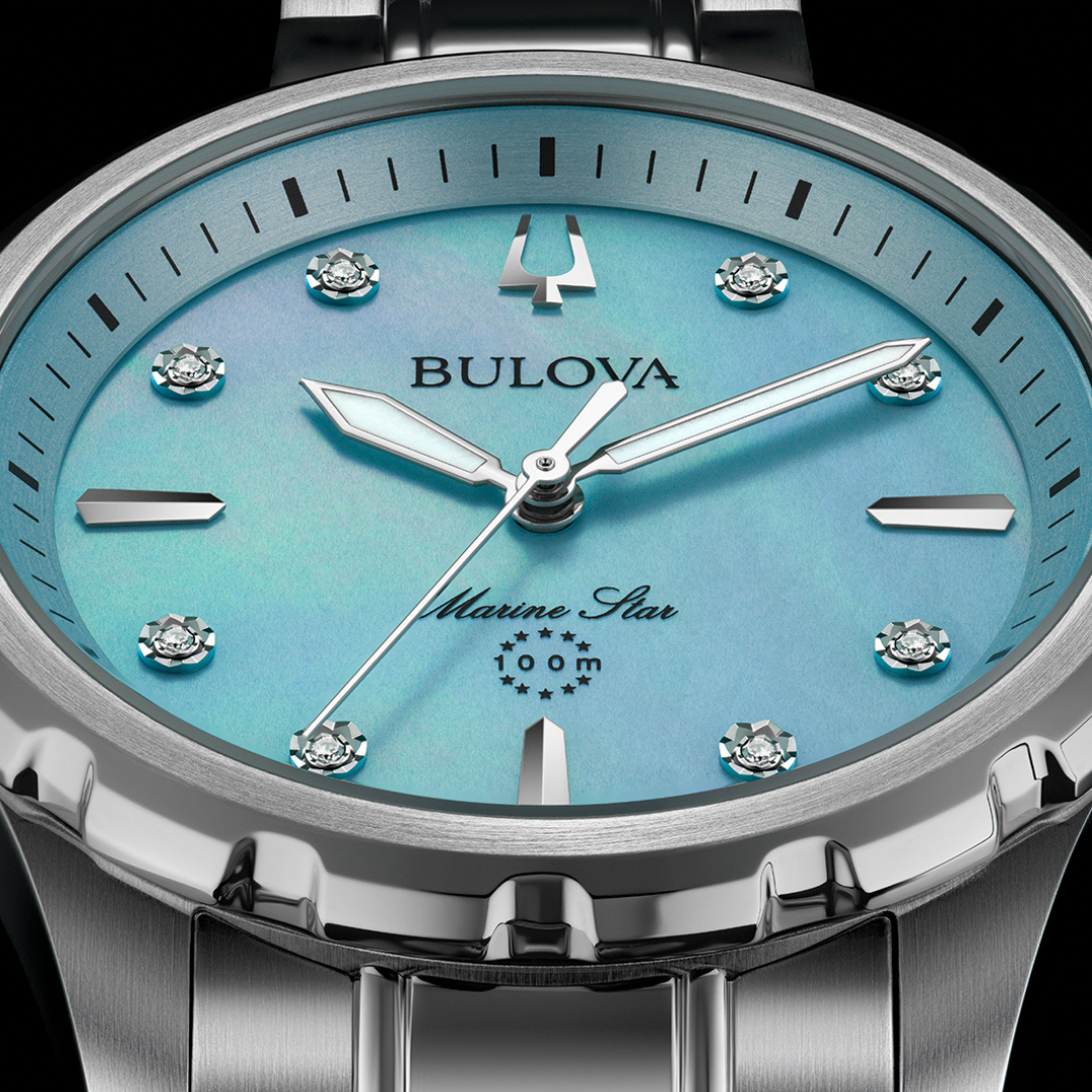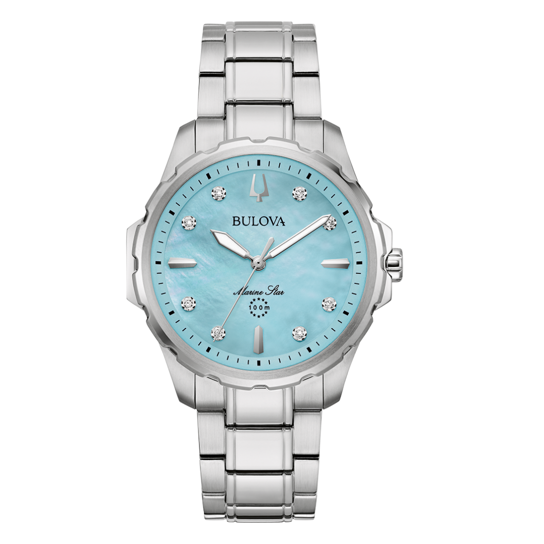 From the legendary Bulova Marine Star collection, this elegant ladies’ timepiece offers unrivalled style. The silver-tone stainless steel case features a modern design with a bold fixed bezel and symmetrical case flanks. A flat sapphire crystal and protected crown provide modern reliability which is furthered by 100m of water resistance. The lustrous blue mother-of-pearl* dial adds a splash of colour to the timepiece, with eight diamond hour markers and a refined handset with luminescent fill for superb legibility in all conditions. The watch is paired with a dual-finished silver-tone quick-release stainless steel bracelet with a push-button deployment closure that provides both comfort and security. For timeless elegance no matter the occasion, this Bulova ladies’ timepiece makes the perfect companion.