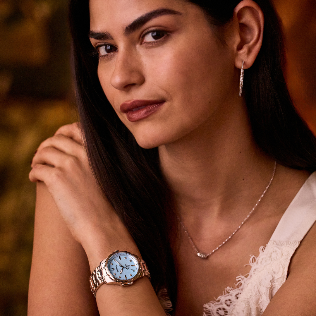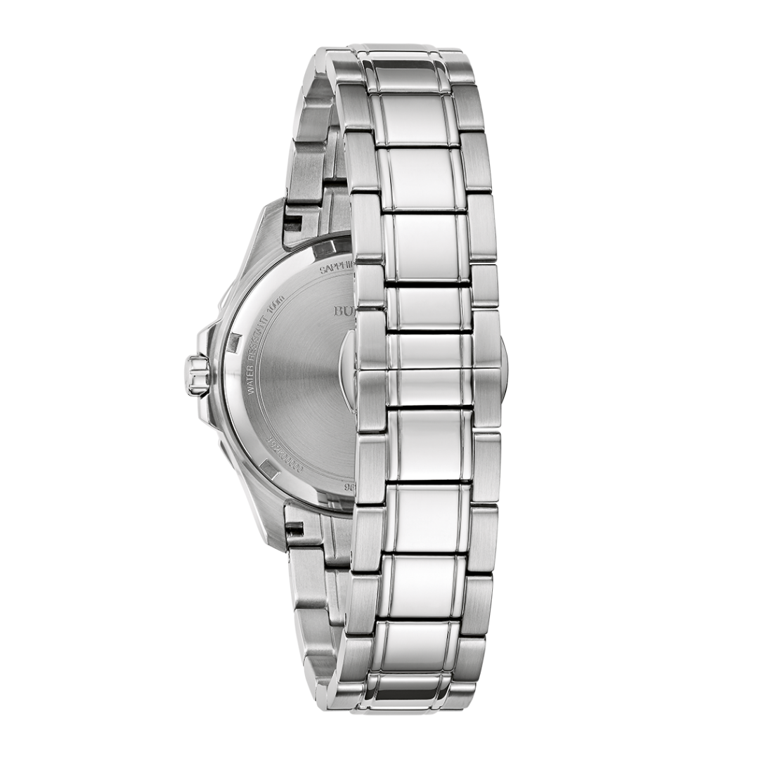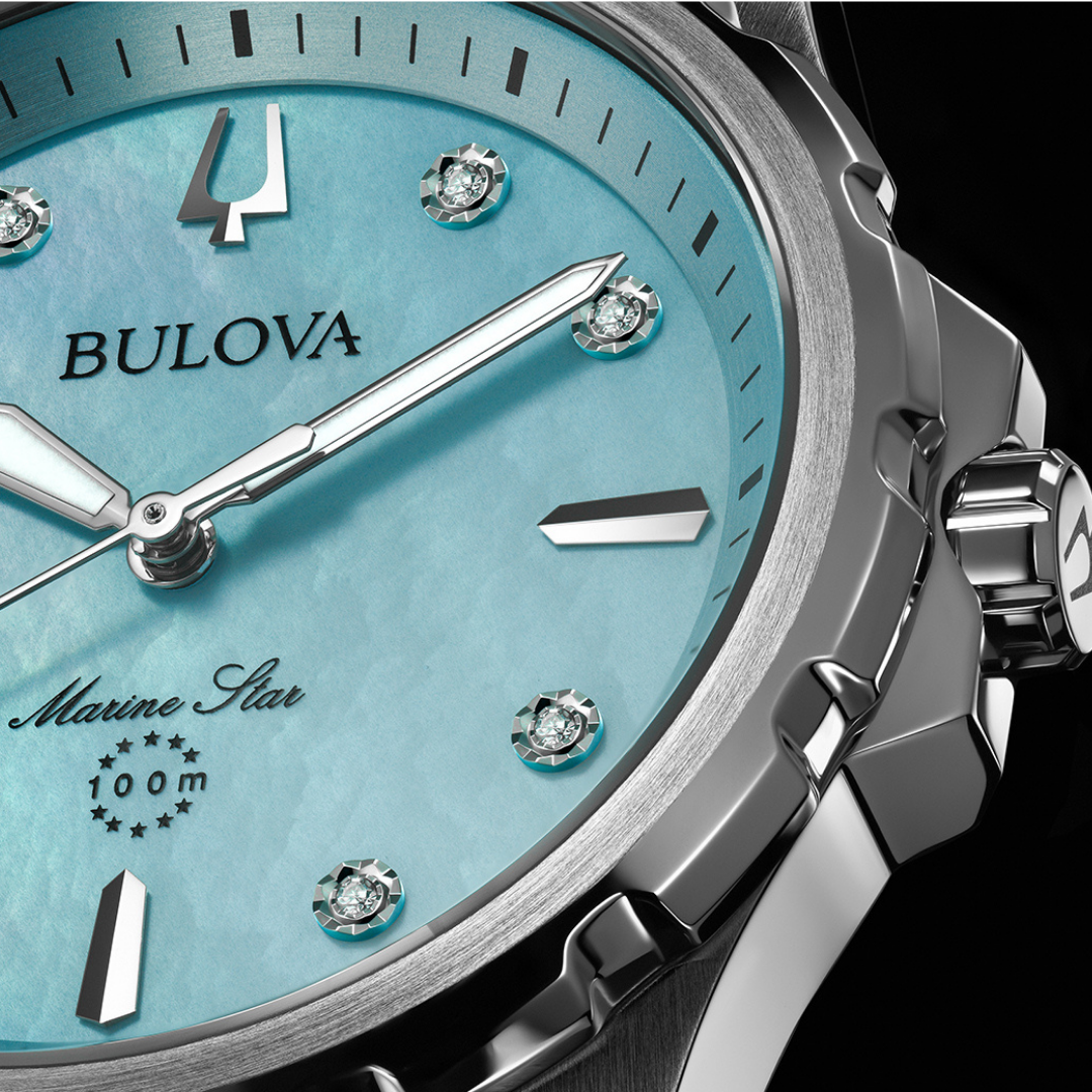 From the legendary Bulova Marine Star collection, this elegant ladies’ timepiece offers unrivalled style. The silver-tone stainless steel case features a modern design with a bold fixed bezel and symmetrical case flanks. A flat sapphire crystal and protected crown provide modern reliability which is furthered by 100m of water resistance. The lustrous blue mother-of-pearl* dial adds a splash of colour to the timepiece, with eight diamond hour markers and a refined handset with luminescent fill for superb legibility in all conditions. The watch is paired with a dual-finished silver-tone quick-release stainless steel bracelet with a push-button deployment closure that provides both comfort and security. For timeless elegance no matter the occasion, this Bulova ladies’ timepiece makes the perfect companion.