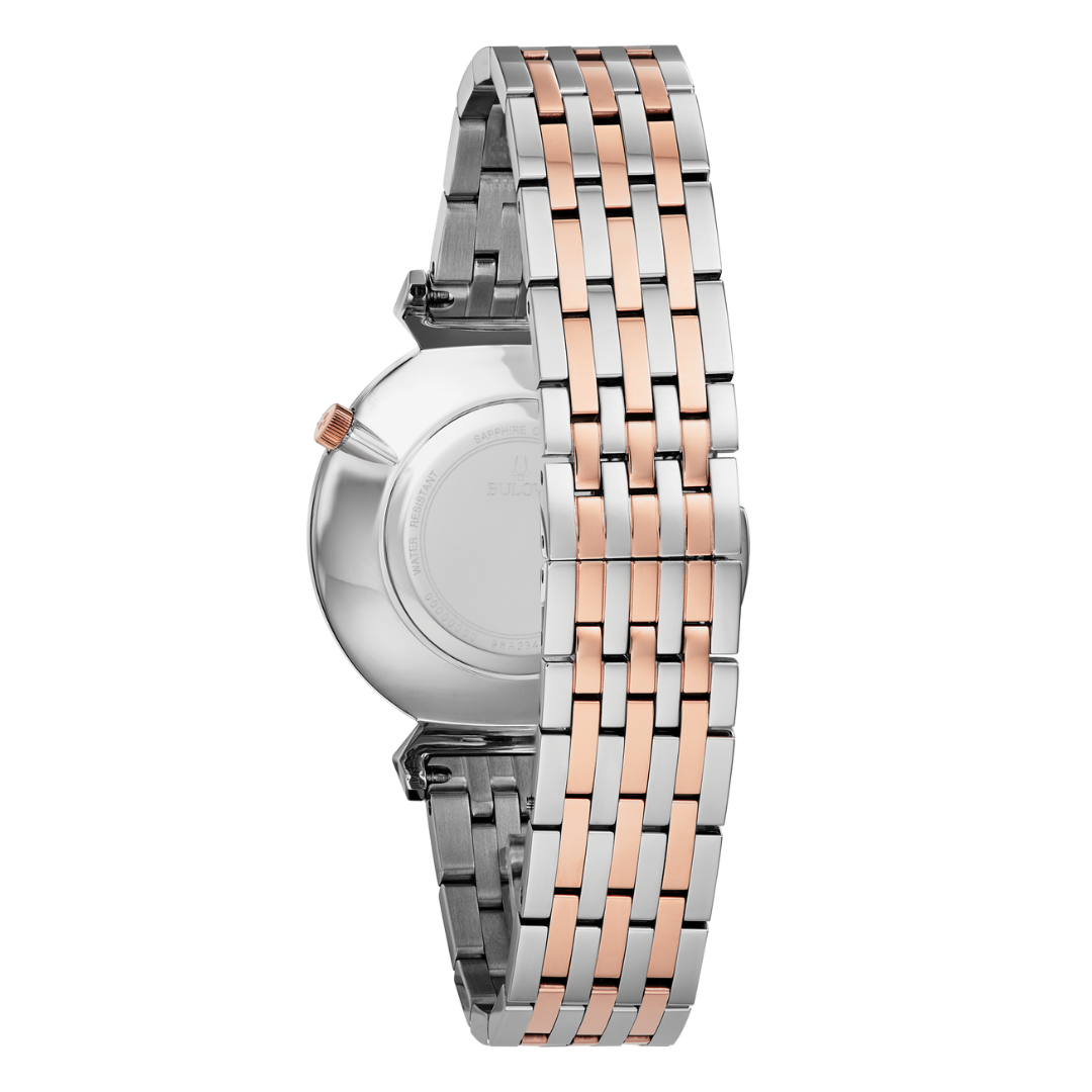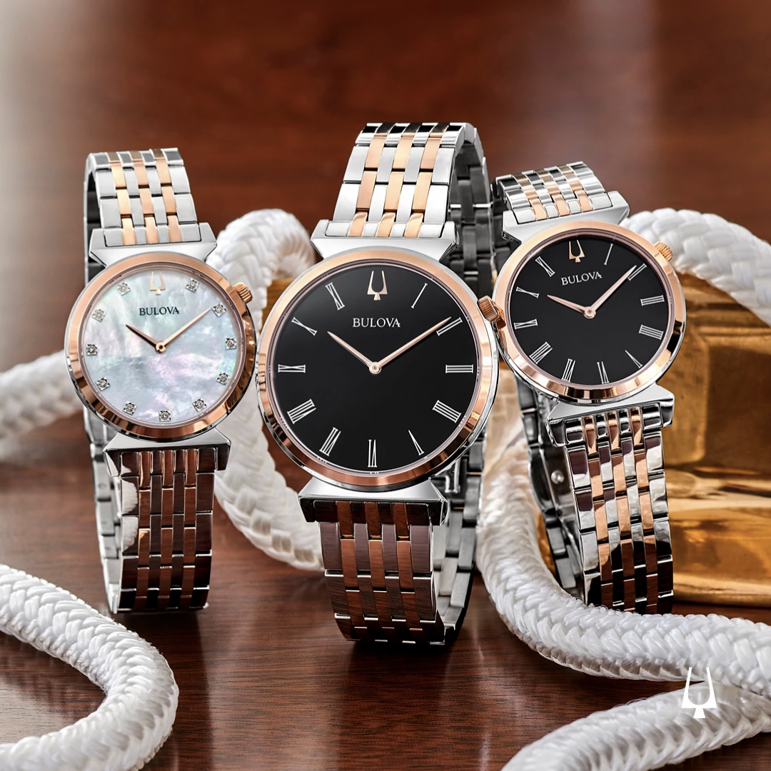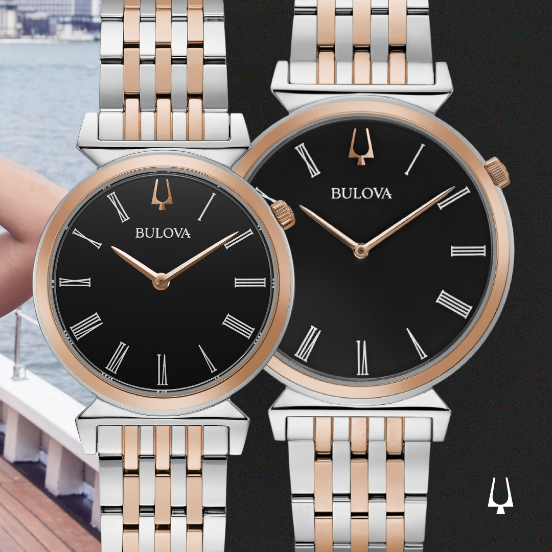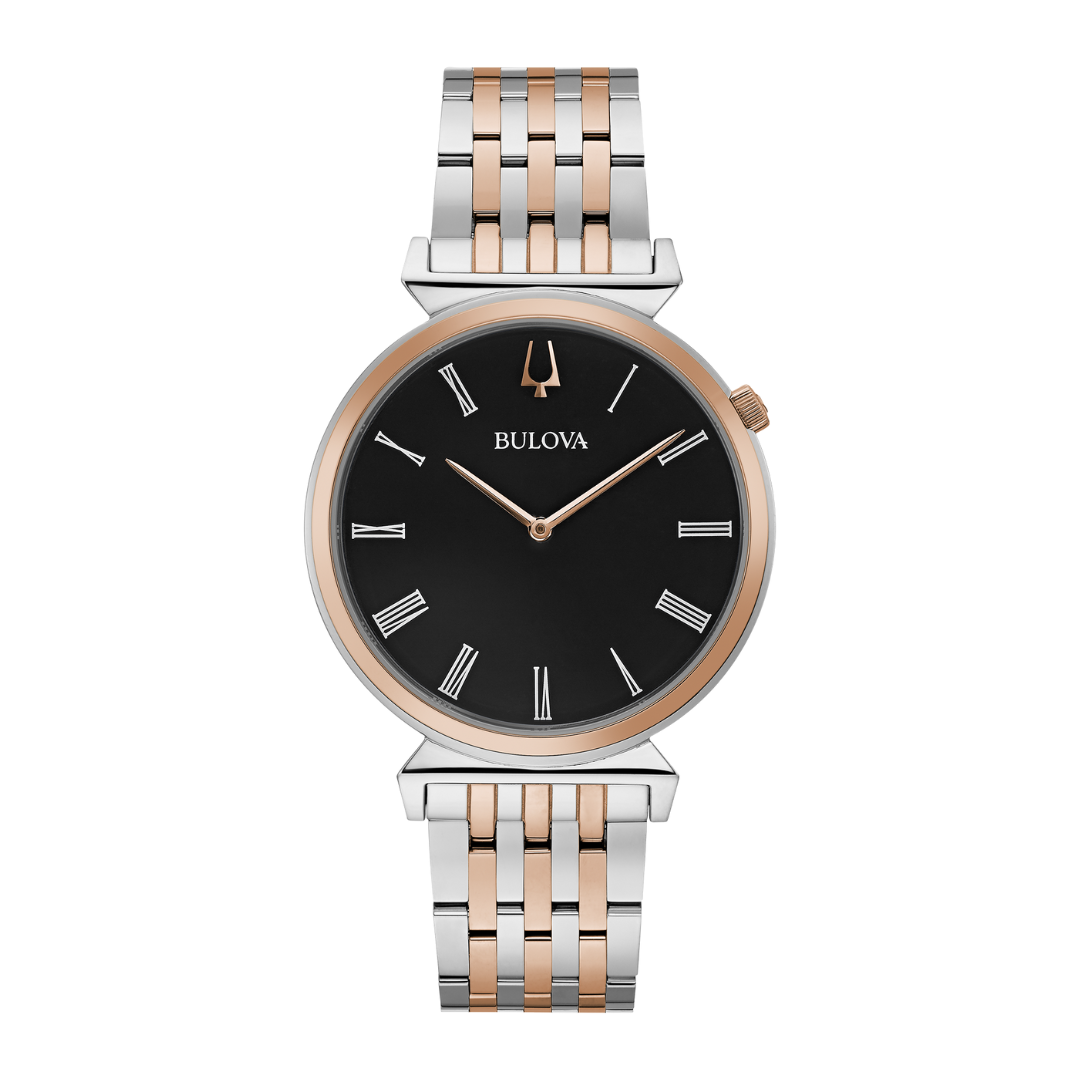 Inspired by Bulova heritage timepieces, the two-tone rose gold-tone stainless steel Regatta features slim Roman numeral markers on a black dial, the crown at the 2 o’clock position, and unique angled lugs. Flat sapphire crystal, slim quartz movement, and water resistance to 30 meters.