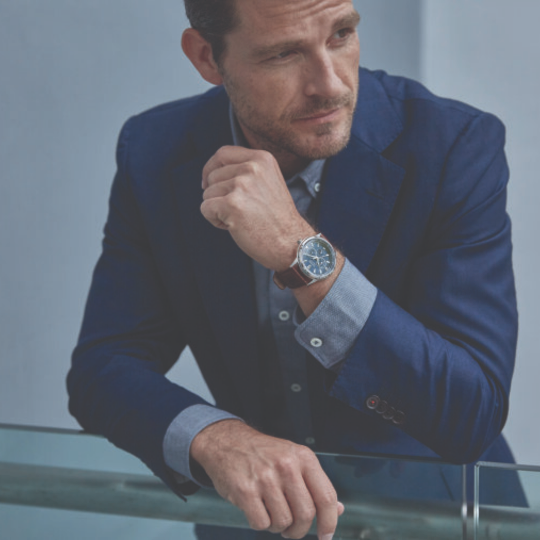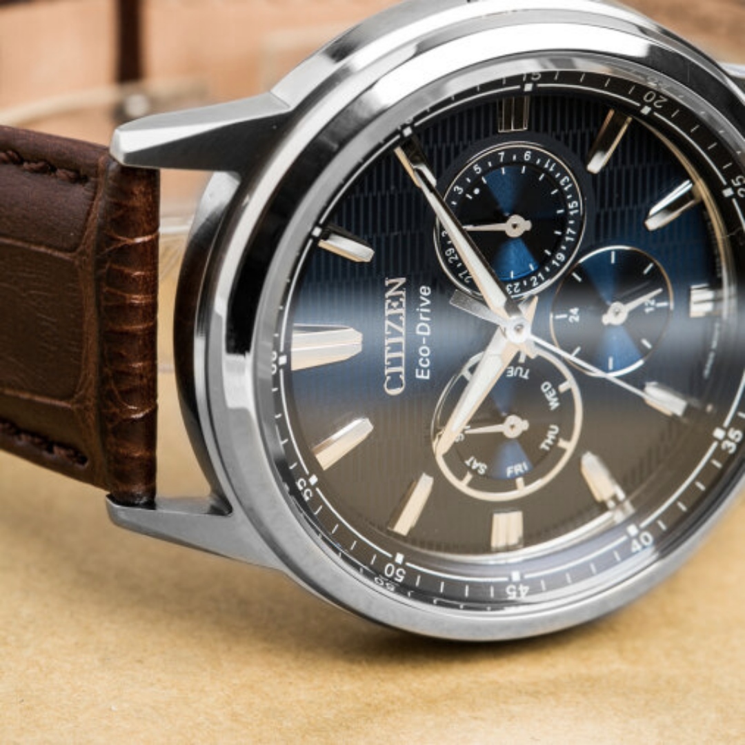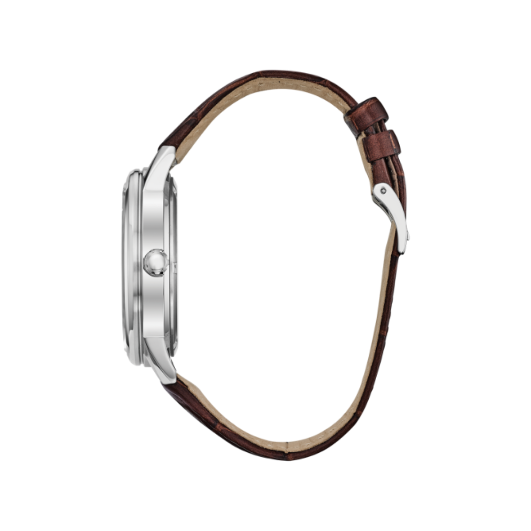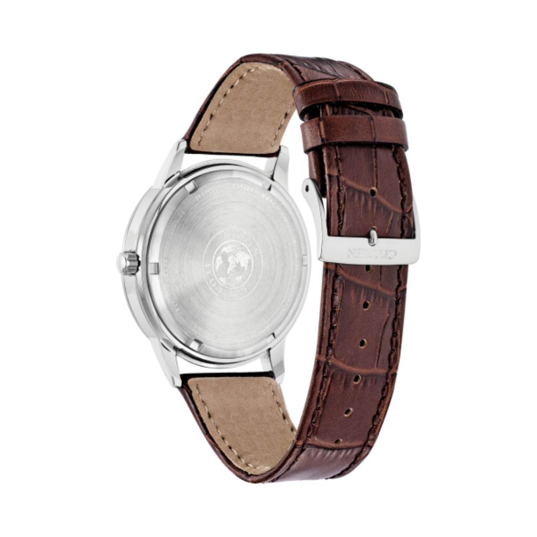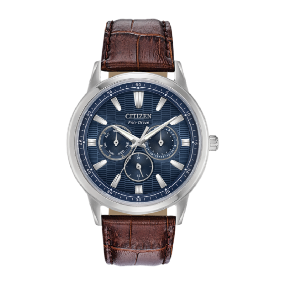 A combination of functional simplicity with a touch of timeless elegance, this Men’s Sport is powered by any light with Eco-Drive technology. This model features a stainless steel case and chocolate brown leather strap with midnight blue dial, day/date display and 12/24-hour time.