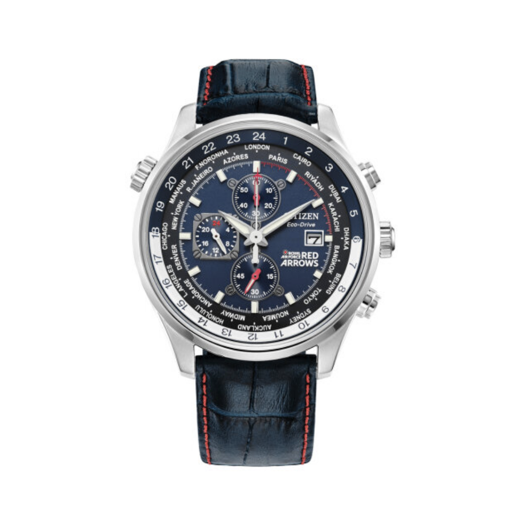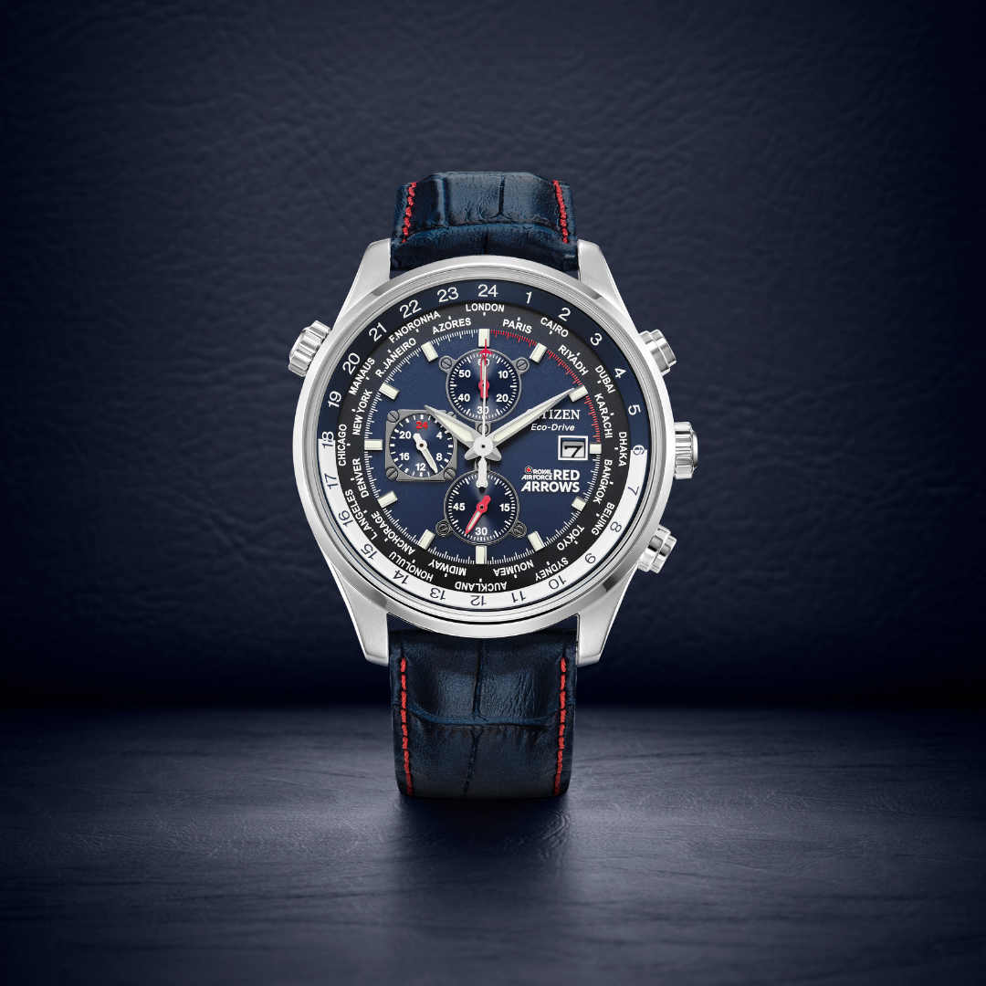 The Red Arrows Chronograph’s are inspired by the Royal Air Force Engineers and Support Team and feature the instantly recognisable ‘blue’ on the dial of the support team’s uniform. This intelligent timepiece features 1/5 second chronograph, world time in 24 cities, screw-back case and movement, date function, water resistant to 100 metres and is sustainably powered by light with Citizen Eco-Drive technology. The blue dial features red accents, the official RAF Red Arrows logo, luminous hands and markers and the look is completed with a blue leather strap with red contrast stitching. Official RAF Red Arrows insignia appears on the case back and presented in a blue Citizen Red Arrows presentation box.