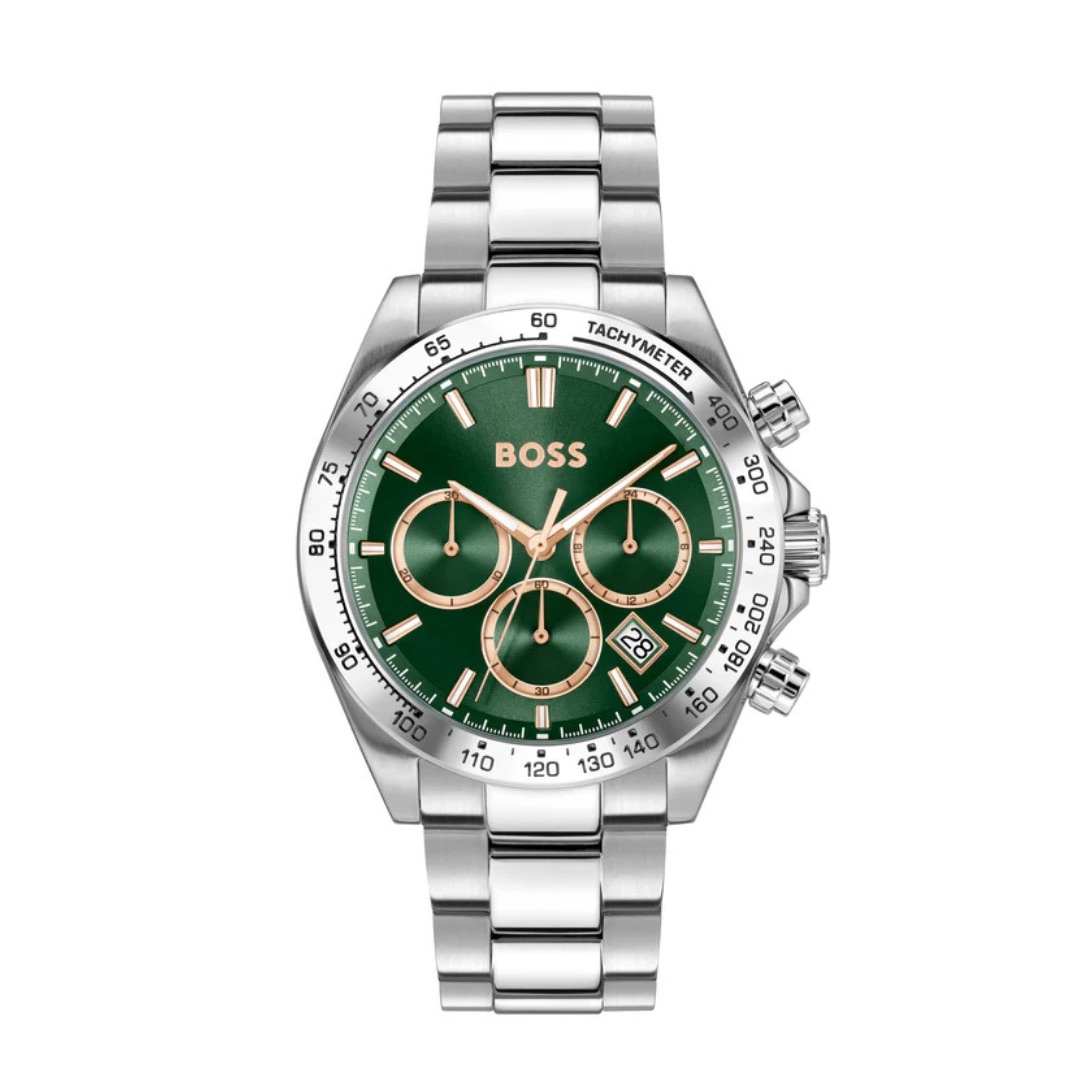 This BOSS Hero 2.0 Chronograph watch is available to buy online & at our store in Tralee, Co. Kerry. Showcasing a 44mm steel case which houses a quartz movement, this BOSS watch is presented on a steel bracelet and finished with a green dial.