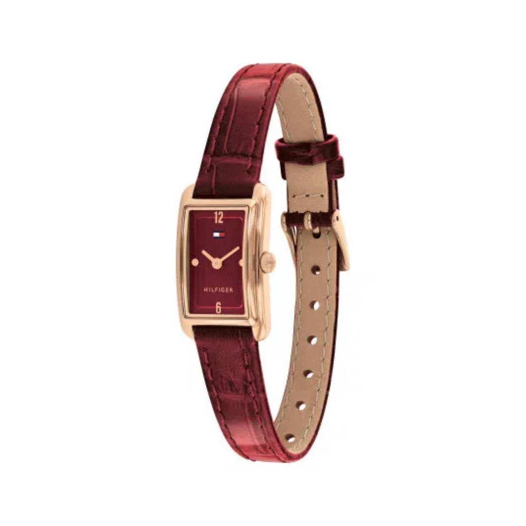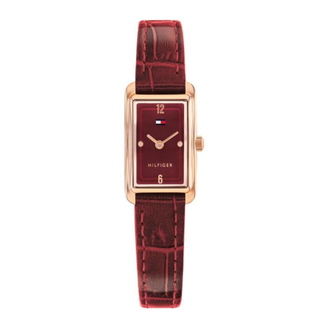 The Tommy Hilfiger Madison showcases a classic rectangular design distinguished by its sophisticated burgundy and gold color combination. The deep burgundy rectangular dial displays only the numerals 12 and 6 in golden finish, complemented by golden dot indices marking the remaining hour positions. The golden hands contrast elegantly against the burgundy background, while the iconic Tommy Hilfiger logo sits discreetly below 12 o’clock. The bordeaux leather strap features a crocodile-textured pattern with tonal decorative stitching, creating a visually refined ensemble.